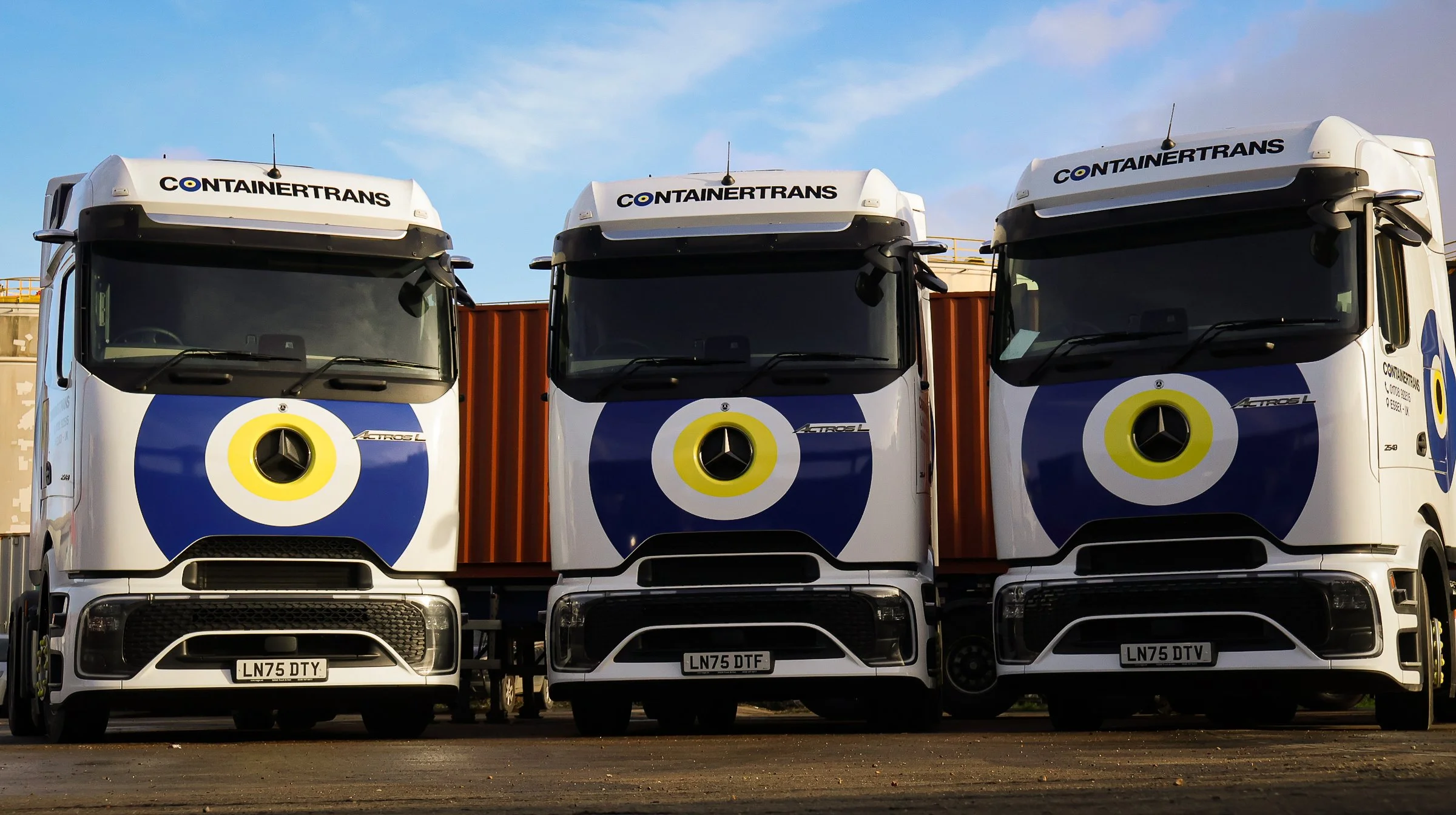 A white truck with the company name 'Containertrans' in black letters, a phone number, and location in Essex, UK, on the side. The truck also features a large graphic of a camera lens in blue, white, and yellow colors.